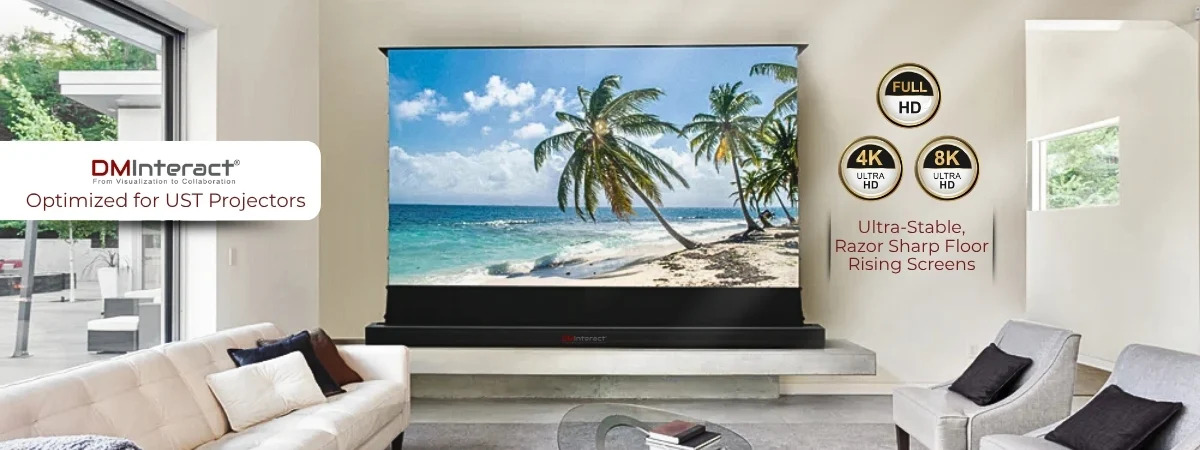 Canada Office: 801 Dundas Street East, Unit #D6, Mississauga, Ontario, L4Y 4G9 Phone: +1 (416) 451-1868 | +1 (416) 302-3017DMInteract 100inch 16:9 4K Motorized Floor Rising Pet Crystal CLR Projector Screen For Ultra Short Throw Projectors