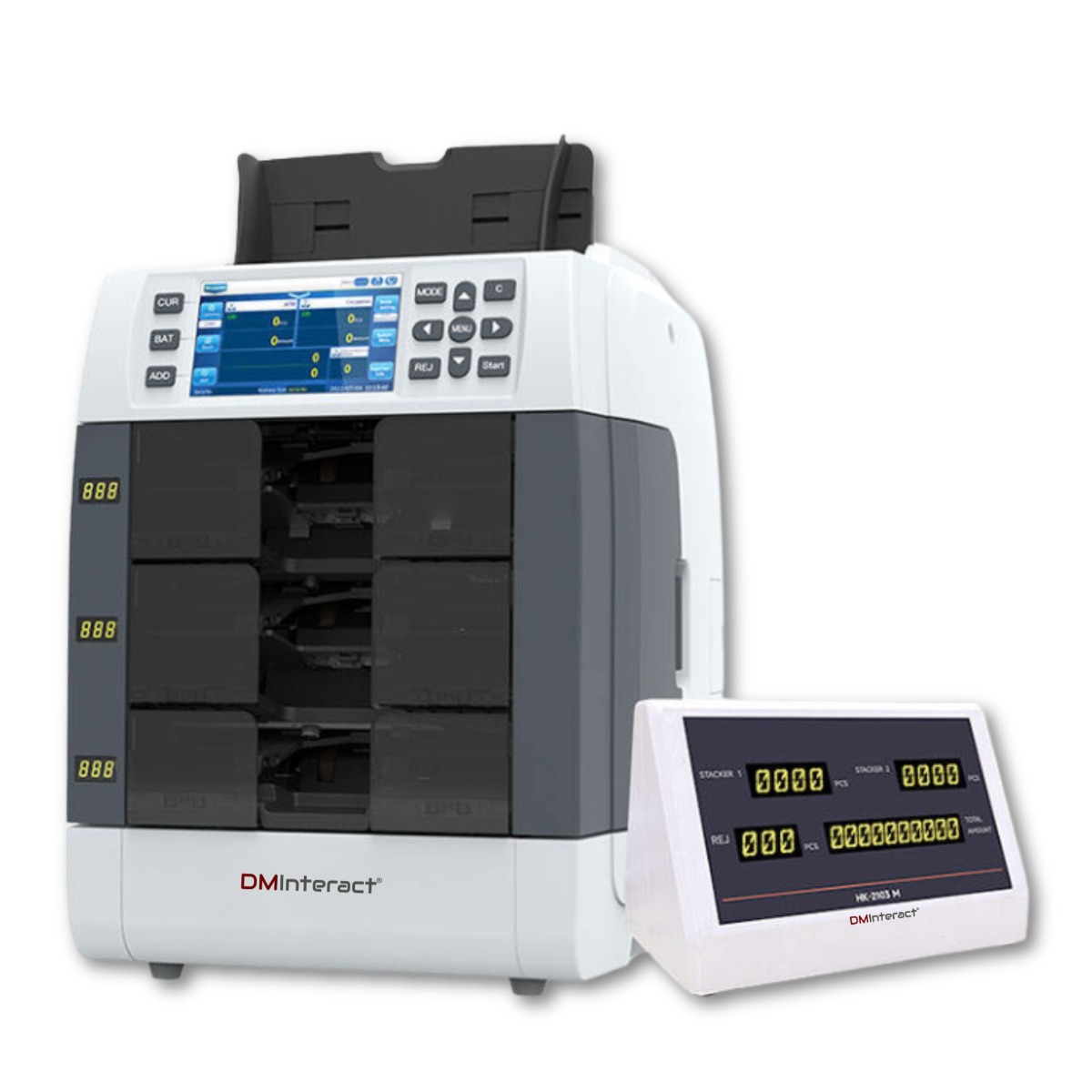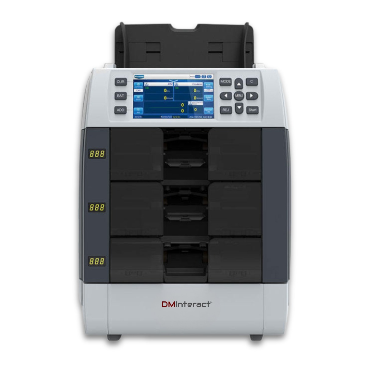 Canada Office: 801 Dundas Street East, Unit #D6, Mississauga, Ontario, L4Y 4G9 Phone: +1 (416) 451-1868 | +1 (416) 302-3017DMInteract DM-3000 3 Pocket Upto 65 Multi Currencies Fitness Sorter And Banknote Counting Machine With Built-In Receipt Printer External Display
