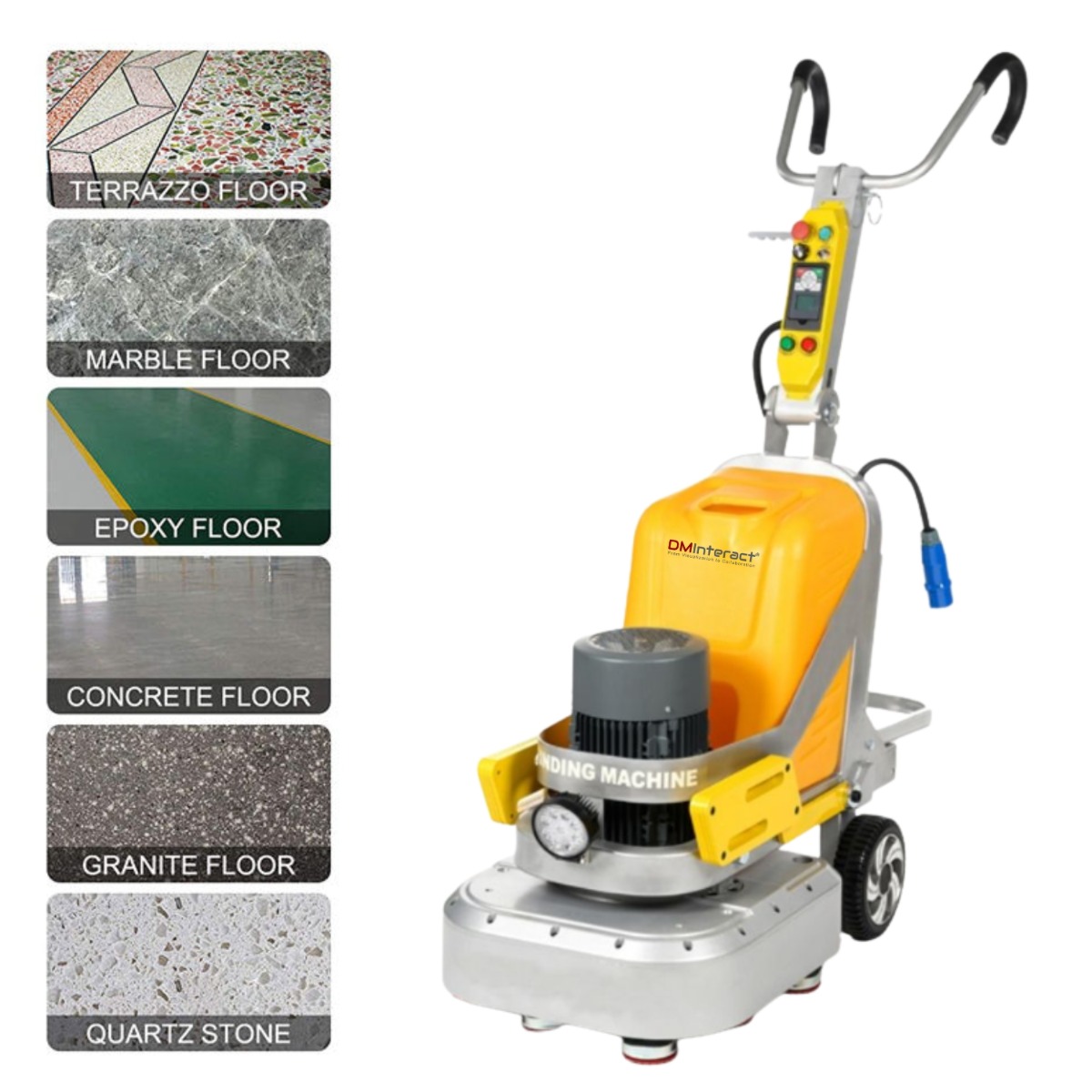 Canada Office: 801 Dundas Street East, Unit #D6, Mississauga, Ontario, L4Y 4G9 Phone: +1 (416) 451-1868 | +1 (416) 302-3017DMInteract DM-620SG 1800rpm 12 Disks 60L Water Tank Integrated Gearbox Planetary Floor Grinding and Polishing Machine