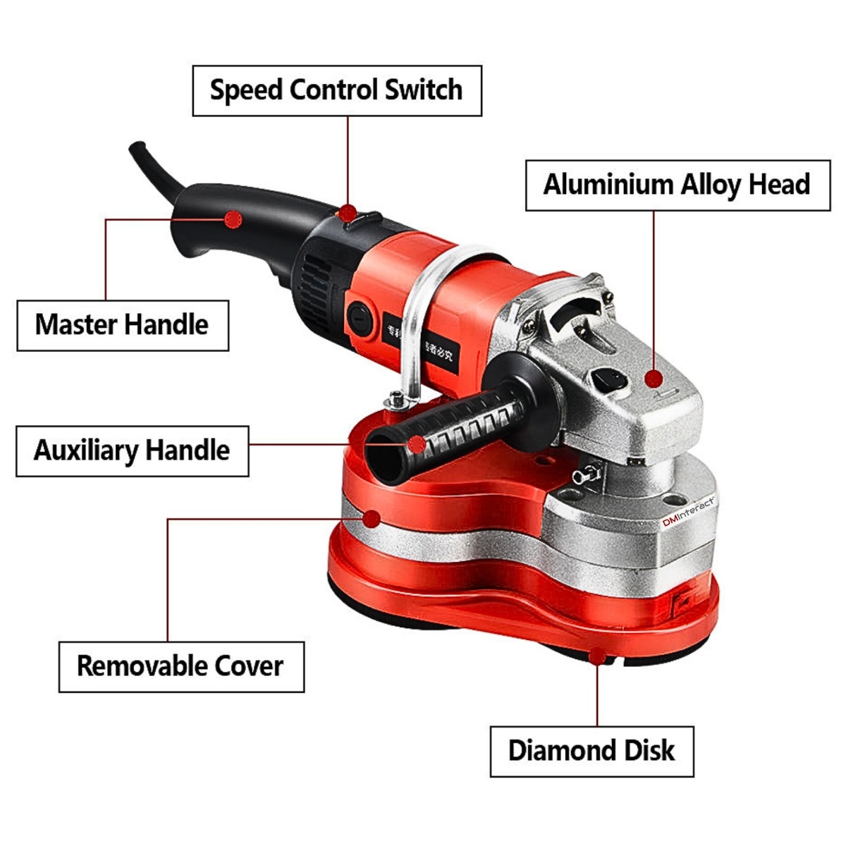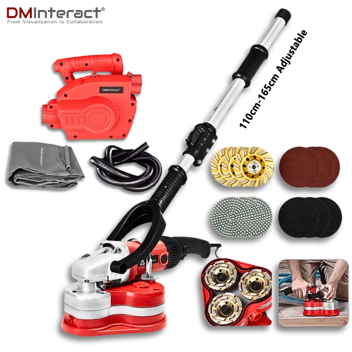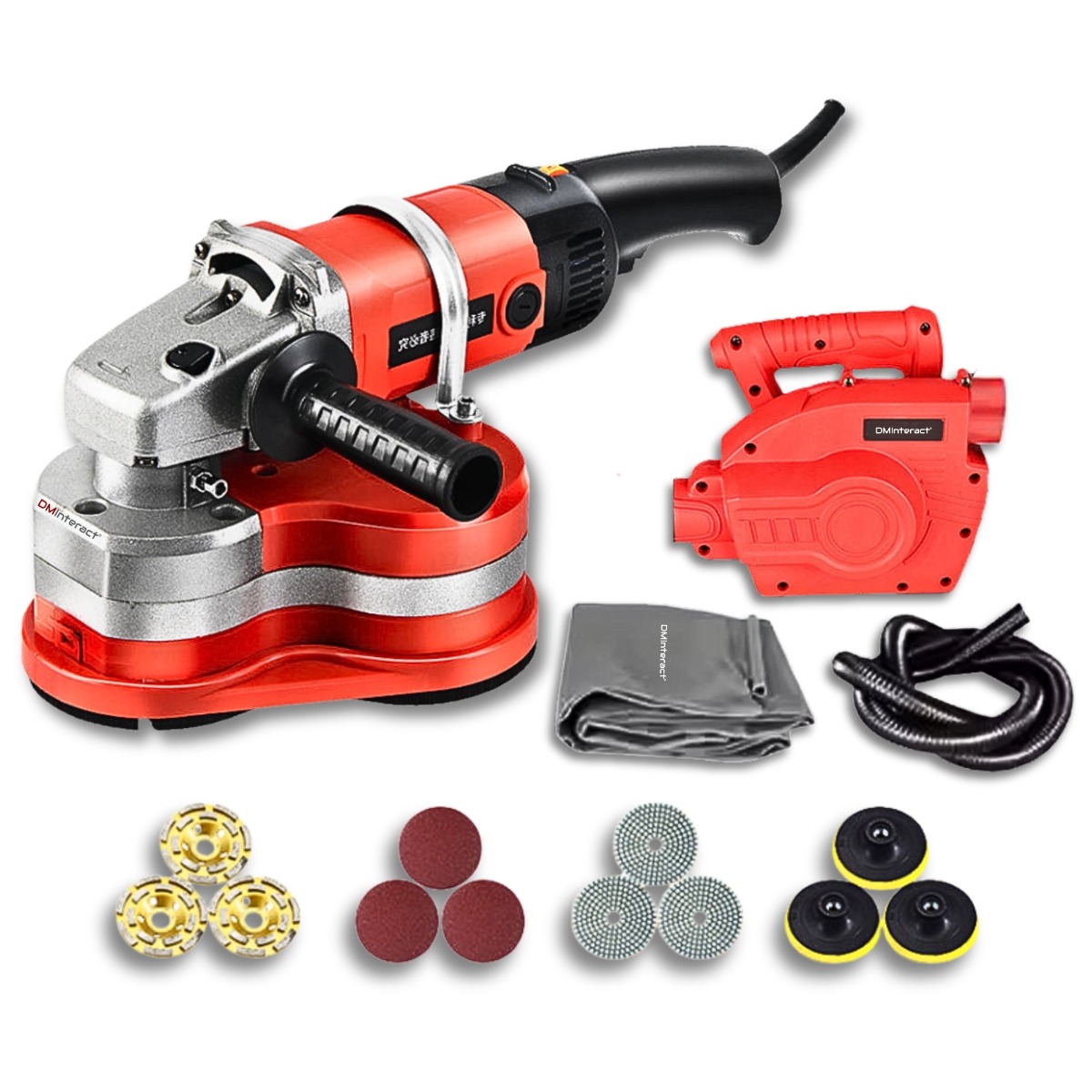 Canada Office: 801 Dundas Street East, Unit #D6, Mississauga, Ontario, L4Y 4G9 Phone: +1 (416) 451-1868 | +1 (416) 302-3017DMInteract DM-FGP310 5400RPM Semi-Automatic Concrete Polishing & Grinding Machine with 4 Types Discs & Dust Vacuum Cleaner